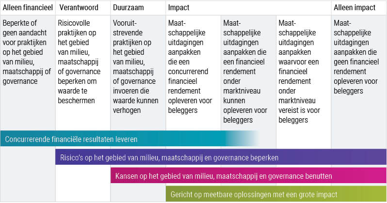 Impactbeleggen gaat nog verder door een direct effect van de belegging in de echte wereld te eisen zonder per se ook een hoger financieel rendement te vereisen, afhankelijk van de doelstelling. De belangrijkste verschillen tussen deze stijlen staan weergegeven in onderstaande afbeelding: