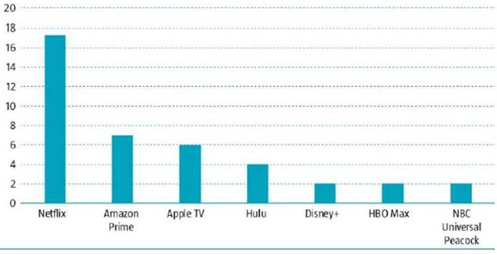 流媒体企业大致分为SVOD供应商和音乐流媒体平台两种。龙头公司有Netflix,Spotify,Apple,Amazon和Google等。其他还有媒体、电信和更广泛的电子消费类公司,如AT&T和Sony等。