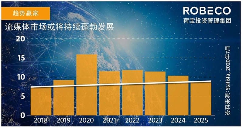 过去几年中,数字消费相关产业经历了深刻变革,流媒体和线上娱乐尤其突出。新冠疫情并未阻挡其成长步伐,全球线上影视产业的销售额在2019到2025间预计将翻一番 [1]。