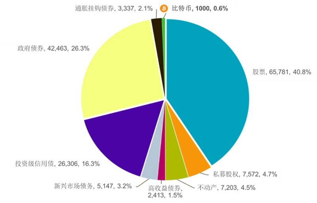 按3月29日5.5万美元的价格计算,比特币市值为1万亿美元,在全球多资产市场投资组合[1]中的占比仅为0.6%。