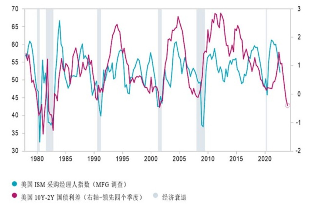 图2:收益率曲线深度倒挂,预示2023年ISM指数或将低于45