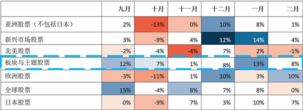 “一个全球性或地区性股票策略会超配或低配特定的地区或行业,力求每年略超市场。主题策略则与此不同,这类策略与生俱来的特点是宽幅震荡,在某些年份可能会大幅领先全球市场,在其他年份又明显落后于全球市场。关键在于要在一个完整周期内实现超越。”