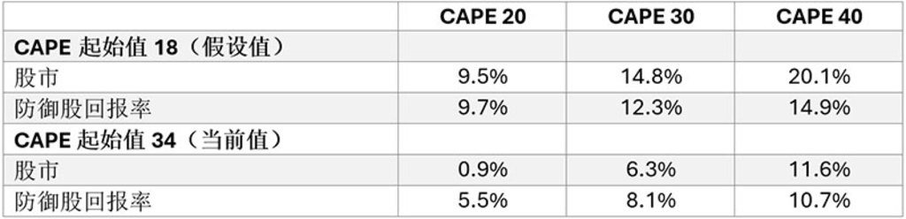 CAPE为30:在CAPE‘长期处于高位’的情景下,股市回报率将处于6%的温和水平,因为估值倍数扩张将不再是回报驱动力。在这种情况下,防御股的表现将更加出色,回报率可达8% 。