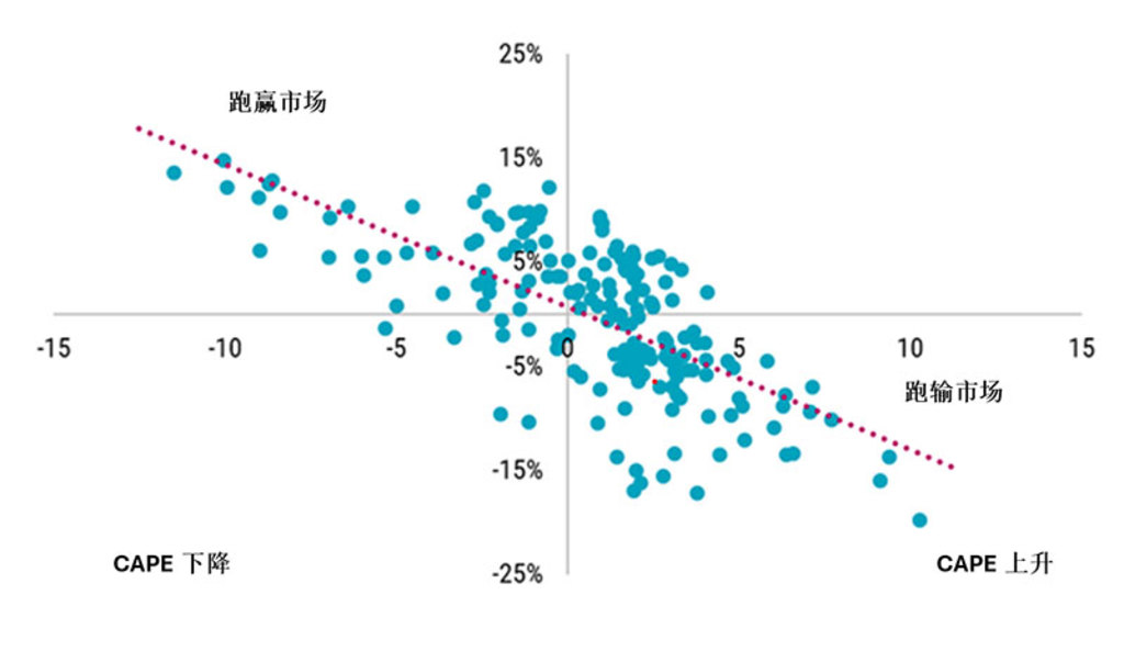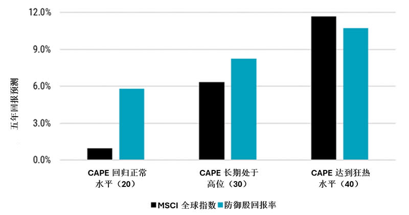早前,我们曾指出较高的周期调整后市盈率(CAPE)通常预示着预期下行风险上升和5年预期回报下降。1在本文中,我们将探讨后者:使用未来三种CAPE情景,根据市场估值倍数变化来调整市场和防御性股票的回报。
