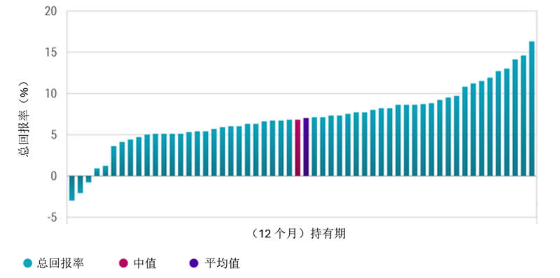为了评估投资级信用债在当前票息环境下的总回报潜力,我们对过去22年中,以类似票息水平起始的12个月周期进行了分析,并计算了这些周期的总回报。下图展示了我们的研究样本中56个周期(每个周期为期12个月)的总回报分布情况,这些周期的起始票息率均介于4%到5%之间。