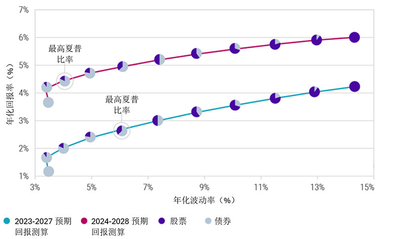 2023-2027年和2024-2028年债券和股票预期回报的有效边界