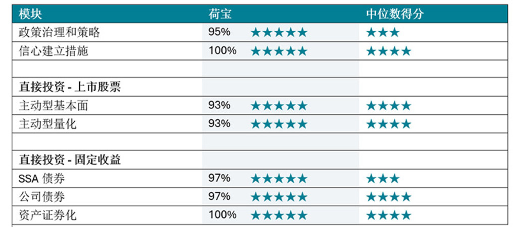 在2024年度PRI签署方评估报告中,荷宝在直接固定收益证券化投资策略和信心建立措施模块均获得了满分100%的卓越成绩。在直接固定收益领域的公司债券和SSA债券模块,荷宝均以97%的高分脱颖而出。而在政策治理和策略模块,荷宝也获得了95%的高分。在直接上市股票策略方面,荷宝的主动型基本面和主动型量化策略均获得了93%的评分。根据PRI的评级标准,所有得分超过90%的模块均被授予最高五星评分。