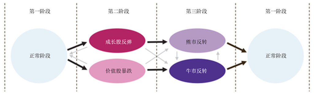 如图1所示,量化周期可分为三个阶段,其中“正常”阶段最为常见。在这一阶段,趋势可能会因价值因子大幅回撤而受到干扰,原因可能是成长股(估值高)上涨,或者是价值股(估值低)暴跌,但随后通常会出现反转,最终回归常态。