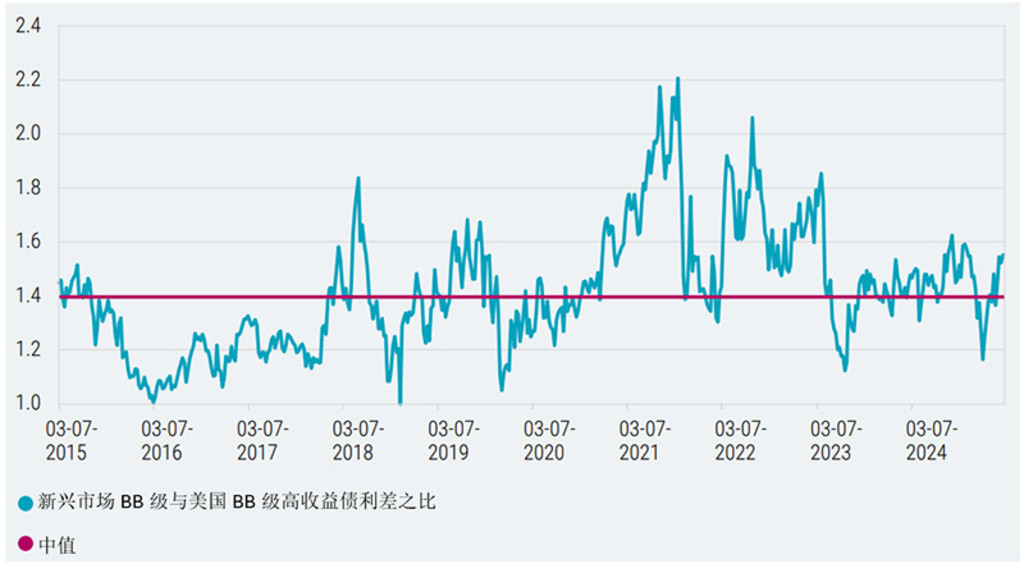 下图显示了新兴市场BB级信用债与美国BB级债券之间的利差对比。尽管新兴市场投资级信用债估值相对较高,我们仍认为新兴市场企业发行的BB级债券存在颇具吸引力的价值机会。