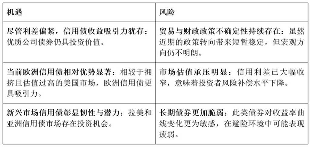 对整体风险持谨慎态度:鉴于当前偏窄的利差环境和多重潜在风险,可维持保守配置。