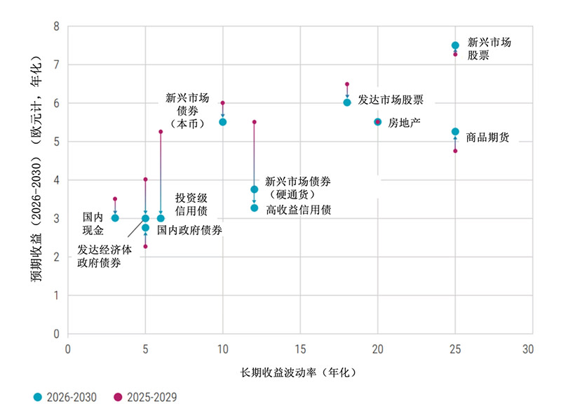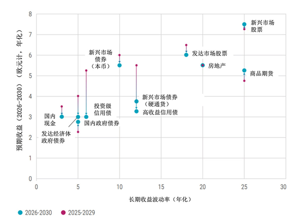 数据来源: 荷宝,2025年9月。纵轴显示欧元投资者在2026-2030及2025-2029期间的预期几何年化收益率;横轴为各资产类别长期波动率的代理指标。