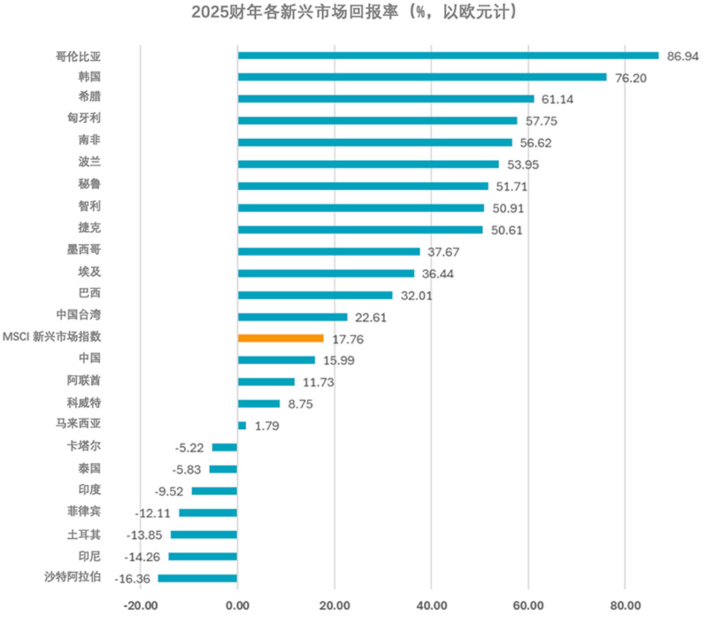 但更值得注意的是新兴市场内部的分化。2025年绝非“一刀切”的新兴市场行情:不同国家之间的表现差异巨大——表现最佳的哥伦比亚全年上涨87%,而表现最弱的沙特阿拉伯则下跌16%,两者回报率差距超过100个百分点(以欧元计)。