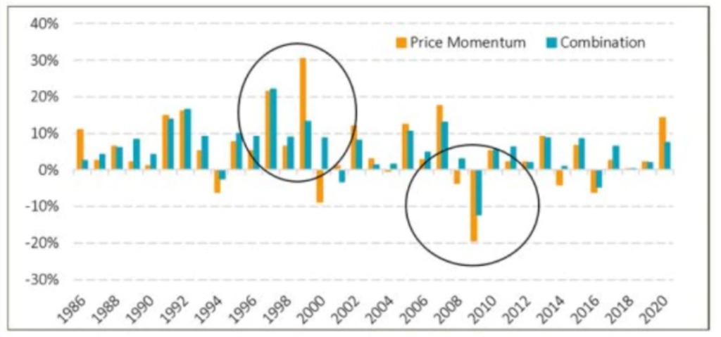 The picture, however, is a bit different when viewed from a longer-term perspective. Figure 2 shows the calendar-year returns of price momentum and an equal-weighted combination of momentum signals based on a historical sample. The graph reveals that a combined approach delivers higher average returns, and, importantly, also provides a much smoother ride compared to the traditional price momentum factor. The most notable performance gaps took place around significant momentum peaks (e.g. height of dot-com bubble) and momentum drawdowns (e.g. such as 2009).