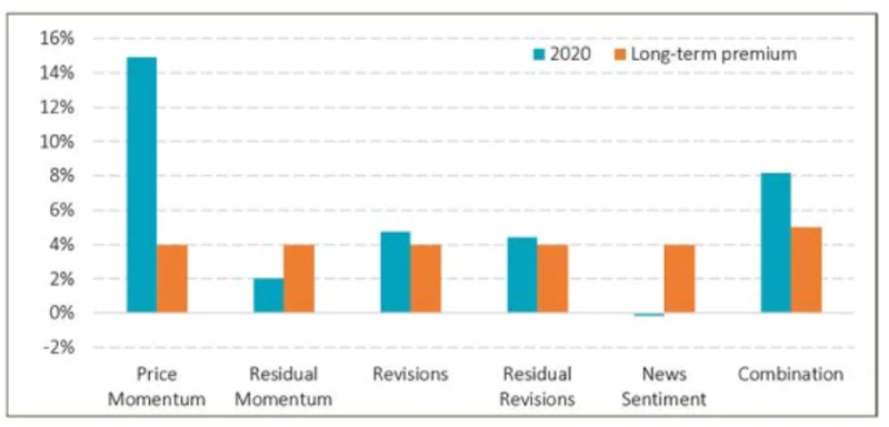 Source: Robeco, FactSet as at November 2020. Figure shows calendar-year returns of portfolios constructed based on price momentum and a combination of price momentum, residual momentum, analyst revisions, residual analyst revisions and news sentiment. The investment universe consists of constituents of the MSCI ACWI augmented with large and liquid constituents of the FTSE World Developed, the S&P Broad Market, and the IFC Investable Emerging Markets Index. Portfolios are constructed by investing in securities ranked in the top 20% of the respective signal and they are reformed monthly.
