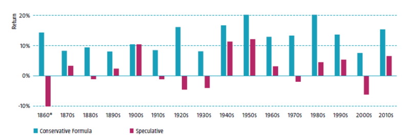 We also investigated how a portfolio based on the Conservative Formula performed in each decade (except for the 1860s as our data only started in 1866), alongside a portfolio (speculative) on the opposite side of the spectrum, i.e., consisting of high volatility stocks with low net-payout yields and weak momentum. As depicted in Figure 2, conservative stocks delivered a positive annualized return in every decade, whereas their speculative counterparts achieved more mixed results. Moreover, conservative stocks beat their speculative peers in all periods.