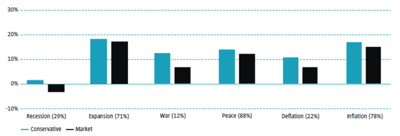 Our deep 155-year sample also gave us the opportunity to study infrequent macro events. For instance, we have only seen a handful of recessions over the last 30 years, but they were quite common in the 19th century. Similarly, there are not many wartime periods we can reference in recent history, but over our sample period there were seven US wars – starting with the Spanish-US war and ending with the Iraq-US war. Inflationary episodes were also more common back then compared to the last 30 years (excluding 2021 onwards). As shown in Figure 4, conservative stocks have generally exhibited resilience in periods that coincided with recession, expansion, peace, war, deflation or inflation.