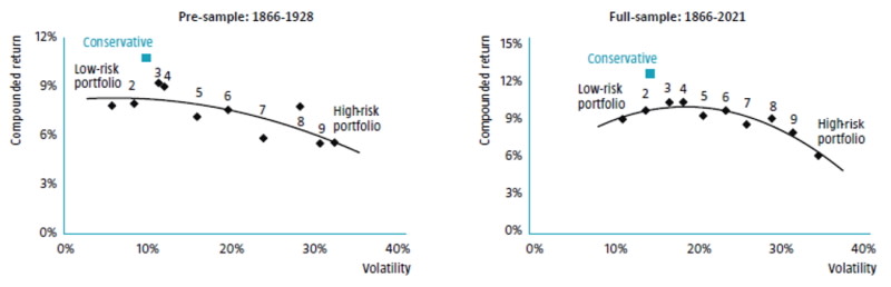 As shown in Figure 1, the relationship between risk and return is negative over the 1866-1928 period as higher-risk portfolios underperformed their lower-risk counterparts. This means that taking additional risk on the stock market was not rewarded. The picture is broadly similar over the full sample period, albeit returns initially increase along with risk, before trending down again as the volatility increases. In general, this informs us that taking on more risk is not necessarily rewarded in the long run.