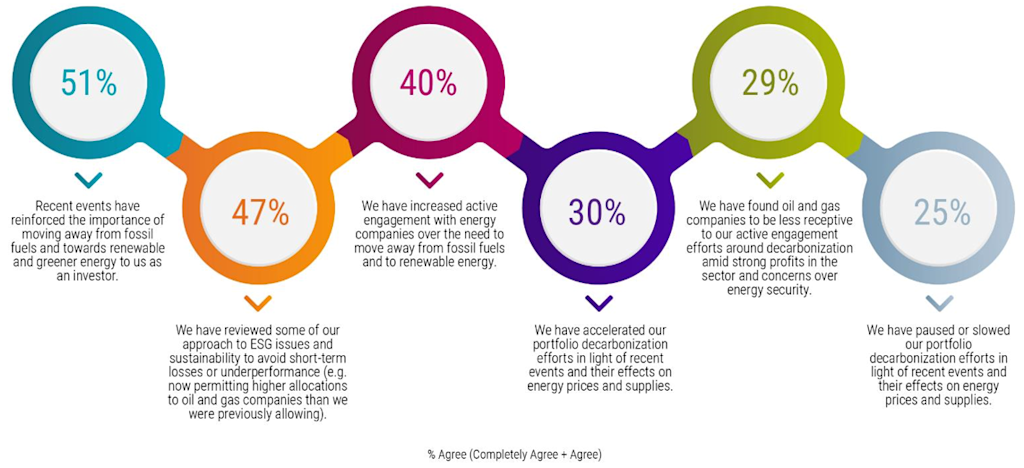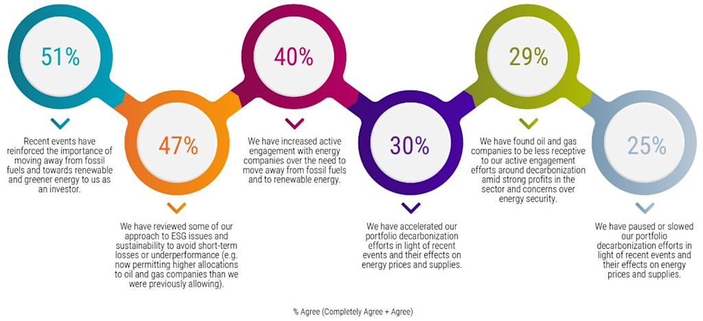 Only 30% of the 300 global investors surveyed have accelerated their portfolio decarbonization efforts in the light of recent events, partly to avoid the higher energy-related costs, while 25% have paused or slowed it. Almost half of investors said they had reviewed some of their approaches to ESG to avoid short-term underperformance.