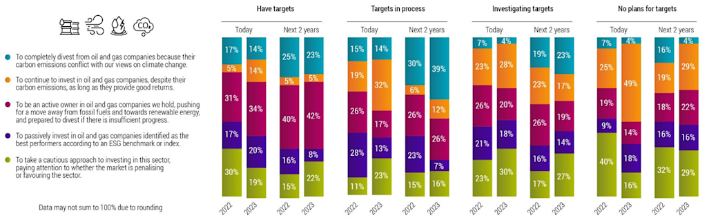 Investors with no net-zero plans were the most likely to continue investing in oil and gas companies, so long as they provide good returns today. But in the next two years, an increasing number said they will take a cautious approach to this sector and become an active owner, pushing for a move away from fossil fuels and towards renewable energy.