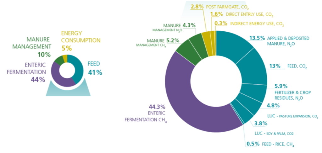 Methane gas, which is emitted from cattle’s digestive tracts. This process, known as enteric fermentation, is the single biggest source of livestock emissions (see Figure 2).