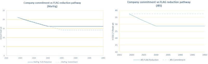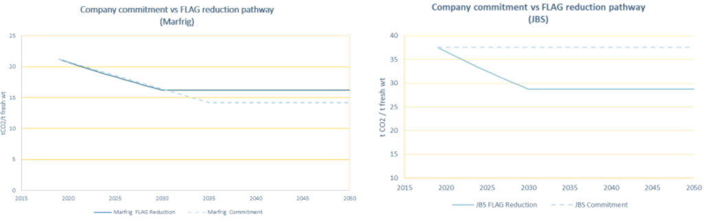 The examples show the planned carbon emission reduction pathways (company commitment path) of two Brazilian beef processors (Marfrig and JBS) versus the SBTi’s science-based emission reduction targets for forest, land and agriculture (FLAG). Marfrig is on track to achieve FLAG targets through 2050. JBS, on the other hand, is lagging, raising its net-zero transition risks.