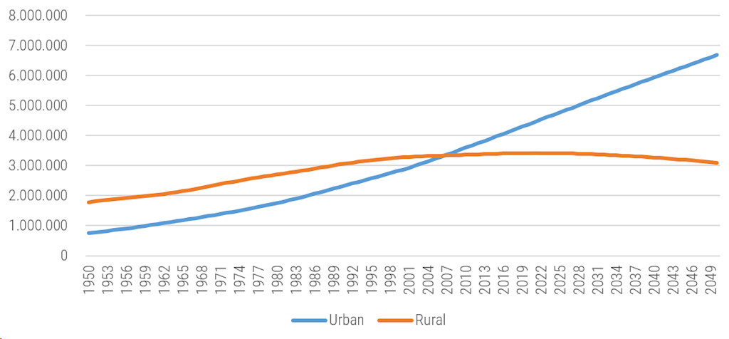 Figure 1: Global urban vs. rural population growth 1950-2050