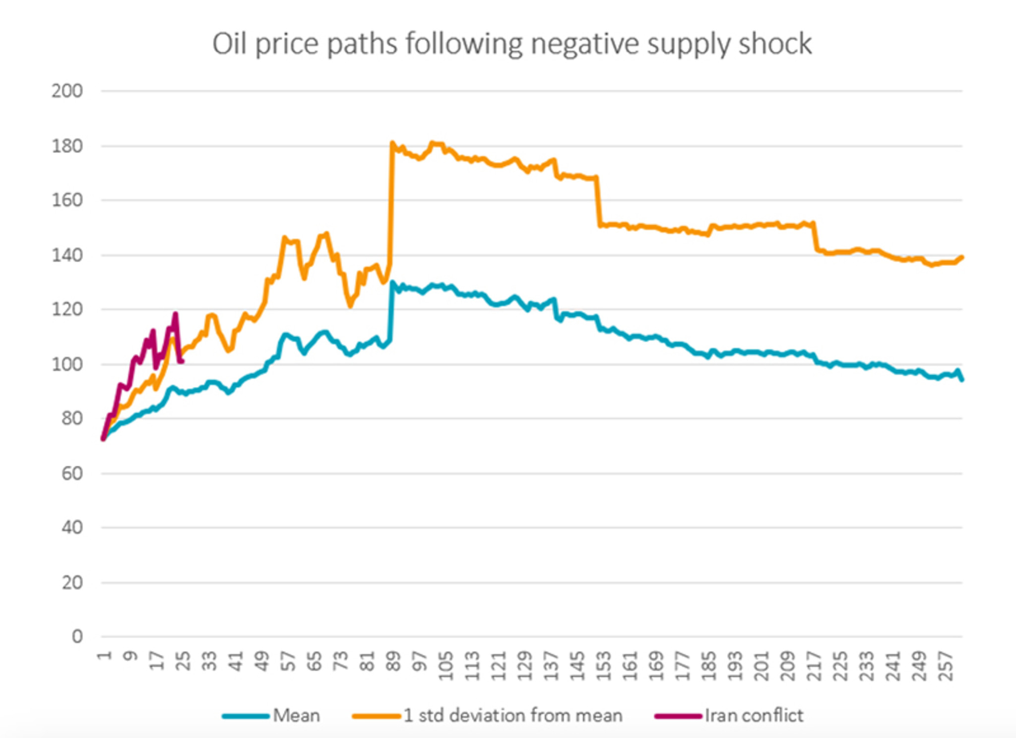 This creates a tension between near term downside risks from energy driven stagflation and the historically high hit rate for positive equity returns after volatility shocks. As long as inflation remains below 4%, we typically are still in the sweet spot for equities. A durable rally likely requires easing geopolitical risk (a sustained, albeit partial re-opening of the Strait of Hormuz) alongside confirmation that second round inflation effects remain contained, allowing central banks to look through the initial headline inflation spike.